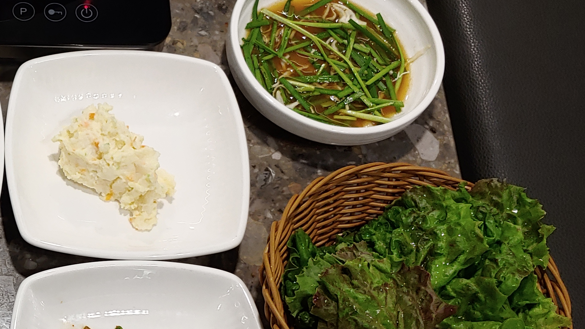 목이버섯 무침, 부추조절임, 가지볶음, 두부부침, 샐러드 등