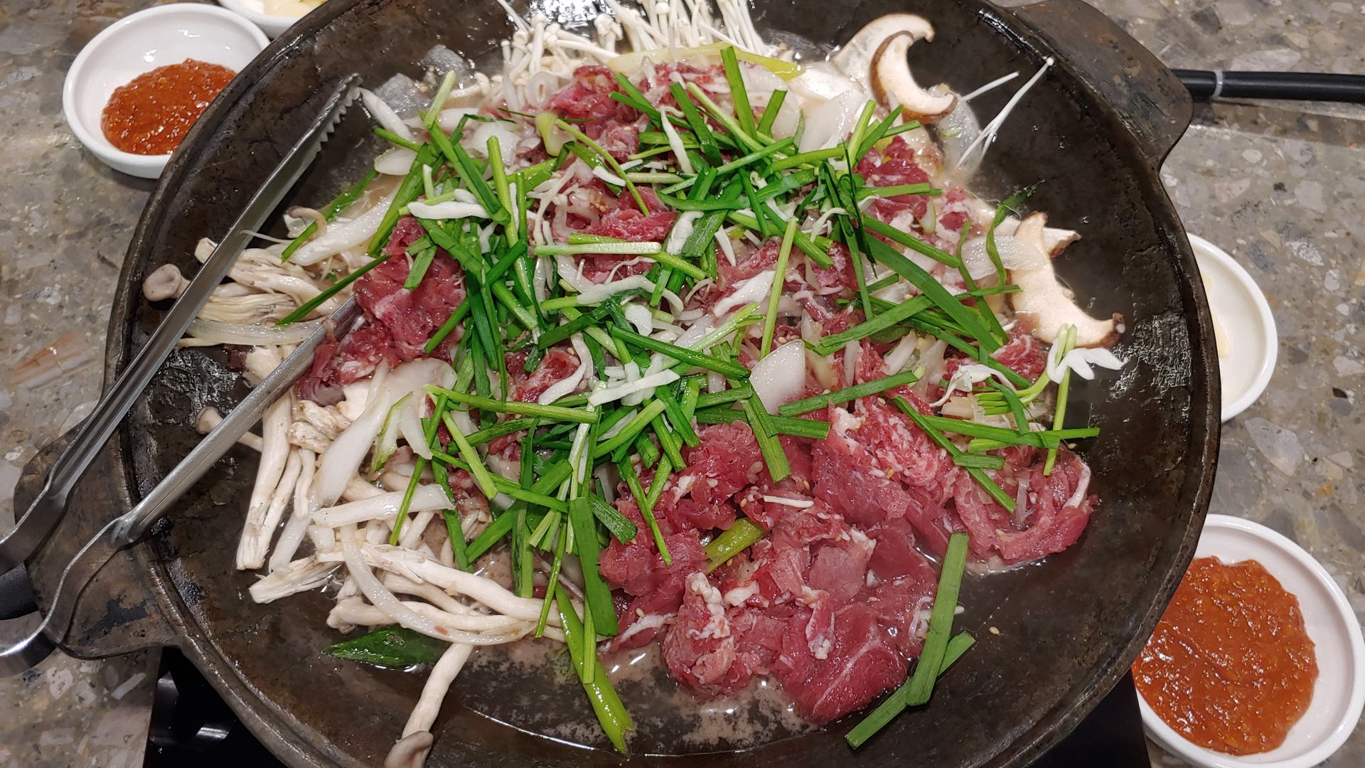 메인 요리인 소고기버섯 전골도 인덕션 위에 올렸고요...